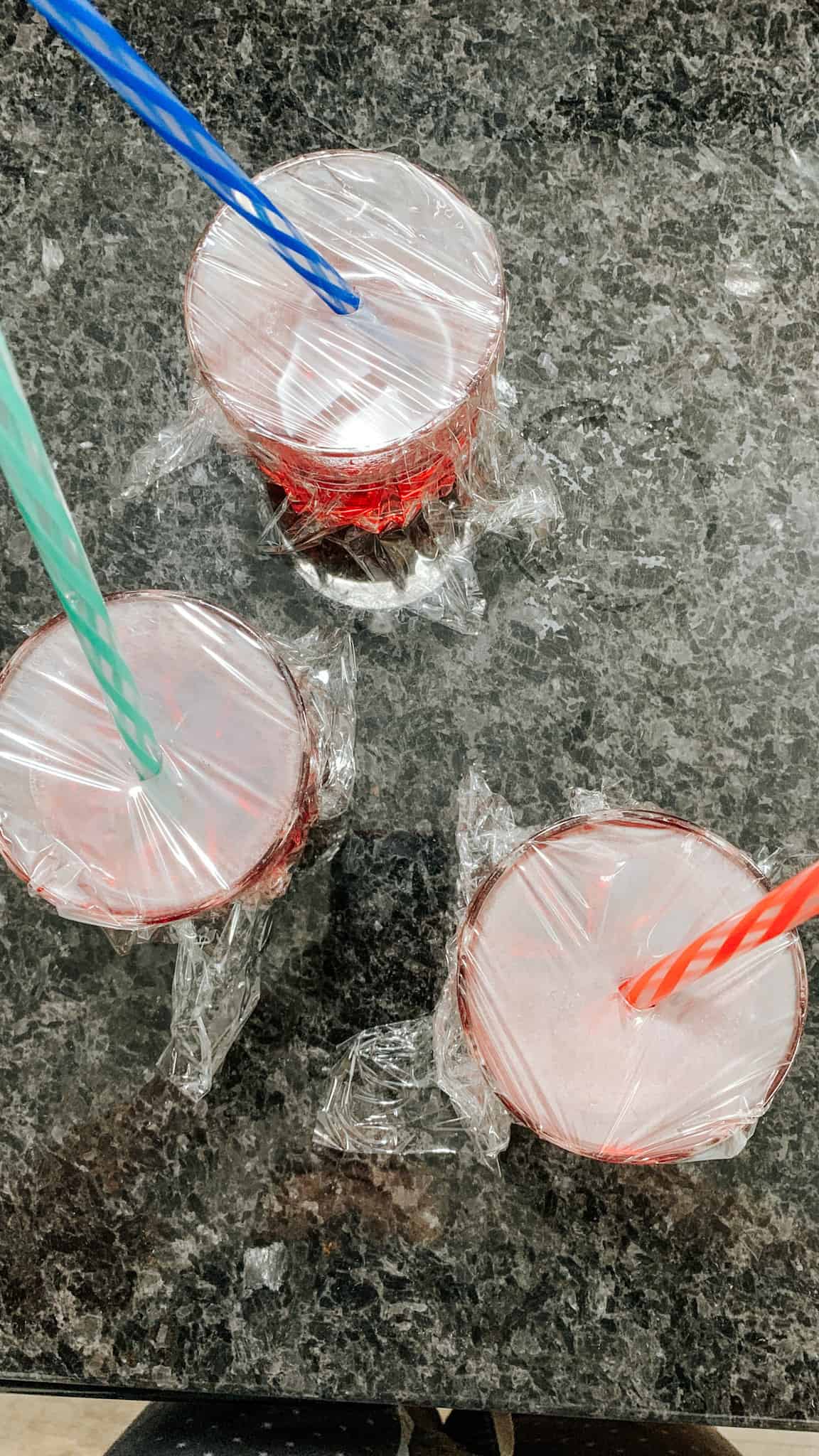 Place the straw in the cup before the jello sets and put it in the fridge.
